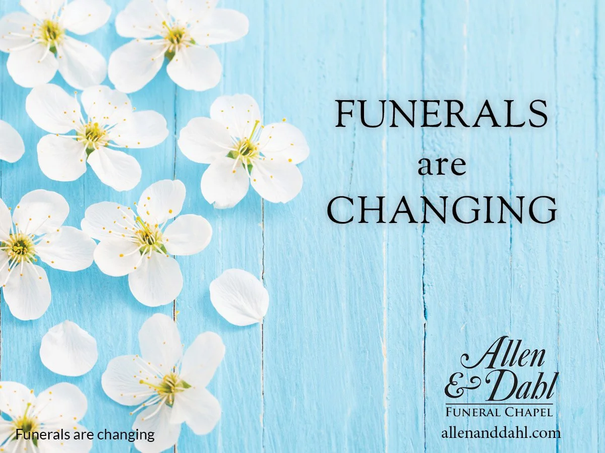 Without a doubt, funerals are changing. Funeral services have become less formal and are noticeably more personal. They are sometimes religious and sometimes they are not. Funerals are often shorter and sometimes take place weeks after the death. There may be more songs, more pictures, and there is much more creativity at many funerals today.